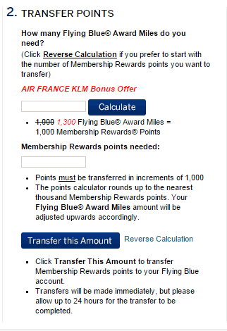 You must be enrolled in the Flying Blue program in order to participate in this offer, visit flyingblue.com to enroll. American Express is not responsible for availability of flight, accommodations or any other rewards in the Flying Blue program. Once you have transferred Membership Rewards points, they become subject to the Terms and Conditions of the Flying Blue program and cannot be transferred back to your Membership Rewards program account. Taxes, fees, charges and surcharges, including airline surcharges, apply on AIR FRANCE and KLM redemption flights and upgrades. See Flying Blue program Terms and Conditions for details. Individual air carrier restrictions may apply. Minimum transfer is 1,000 Membership Rewards points. Redeem for this exclusive offer from 12:00 a.m. CT on October 15, 2015 to 11:59 p.m. CT on November 26, 2015 to receive 30% additional Flying Blue Award Miles. Additional Flying Blue Award Miles will be awarded at the time of transfer.